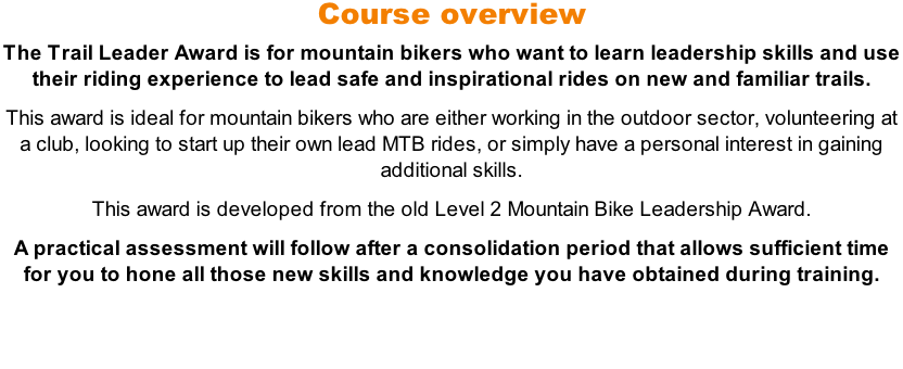 Leaders wishing to use another leadership award to become a British Cycling Trail Leader should refer to the Recognition of Prior Learning (RPL) route to Trail Leader assessment guidance.